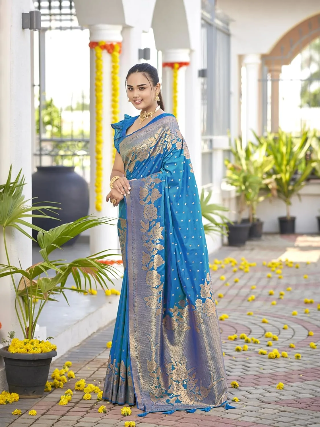 Elevate your ethnic style with this exquisite Blue Banarasi Silk Saree. Designed with a luxurious jacquard weave, this saree is perfect for festivals, parties, and weddings. The saree comes with a matching unstitched blouse piece, giving you the freedom to customize your look.