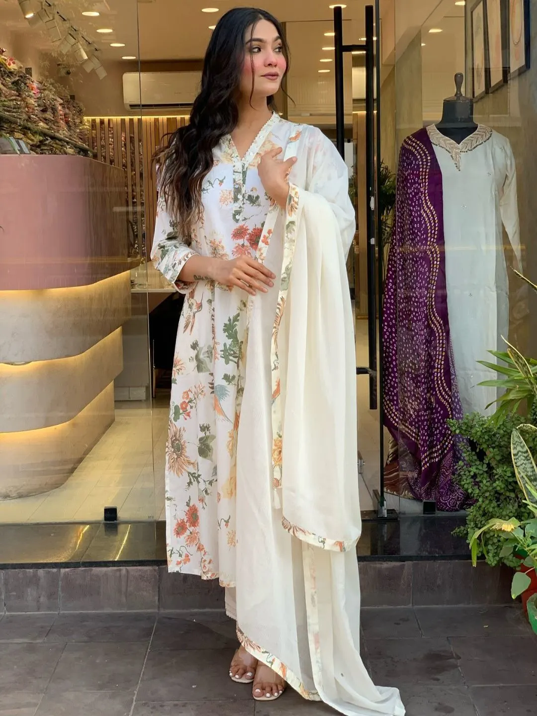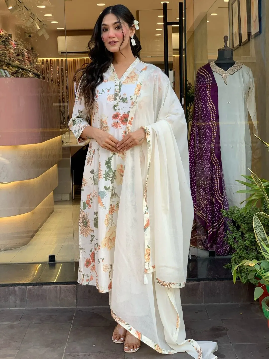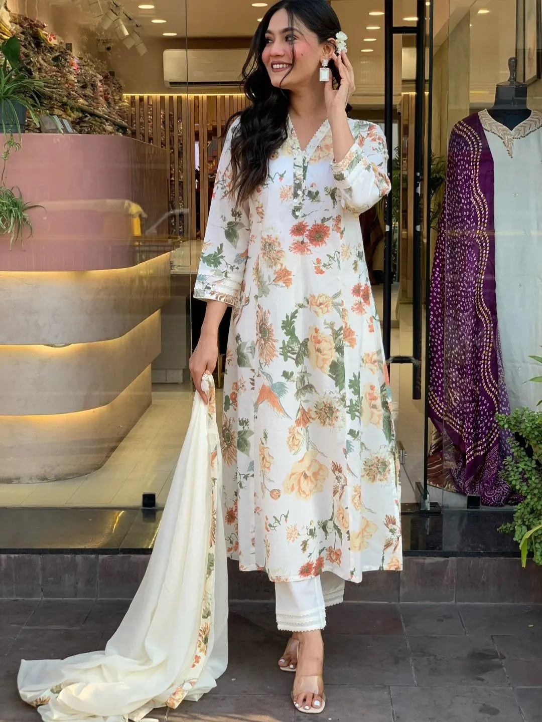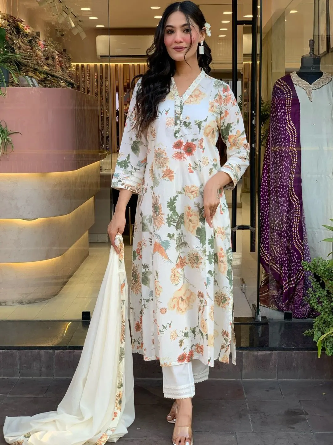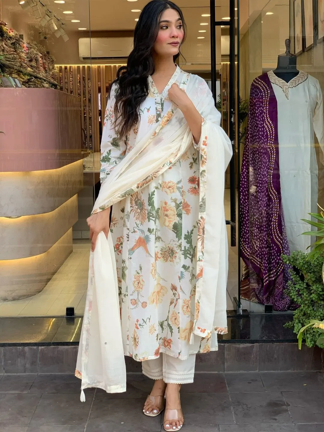 Elevate your ethnic wardrobe with this floral printed kurta set featuring a cream, yellow, and green kurta, matching trousers, and a jute cotton dupatta. Designed with a straight silhouette, V-neckline, and three-quarter sleeves, this set is perfect for festive occasions and casual celebrations.