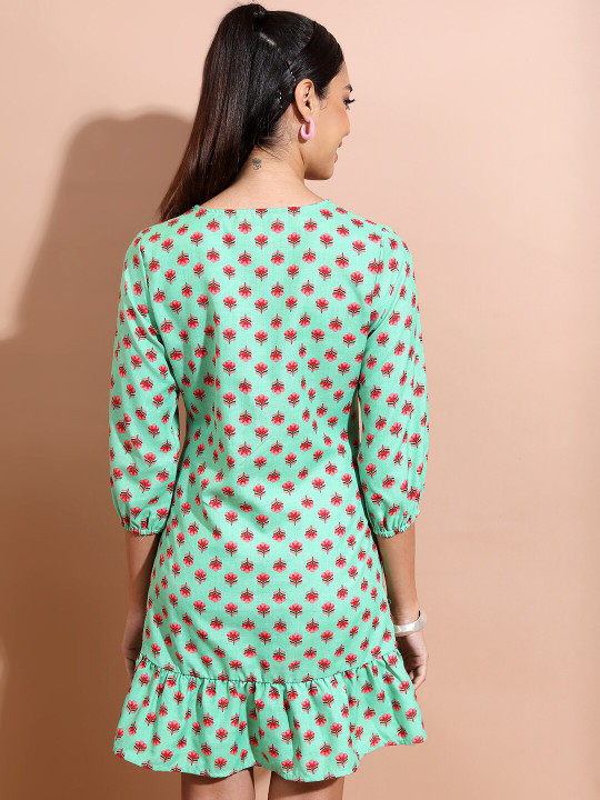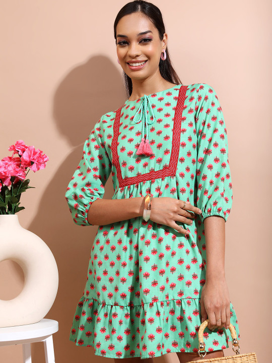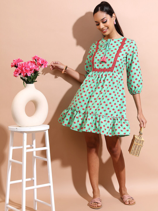 Green Floral Printed Tie Up Neck Mini A-Line Dress