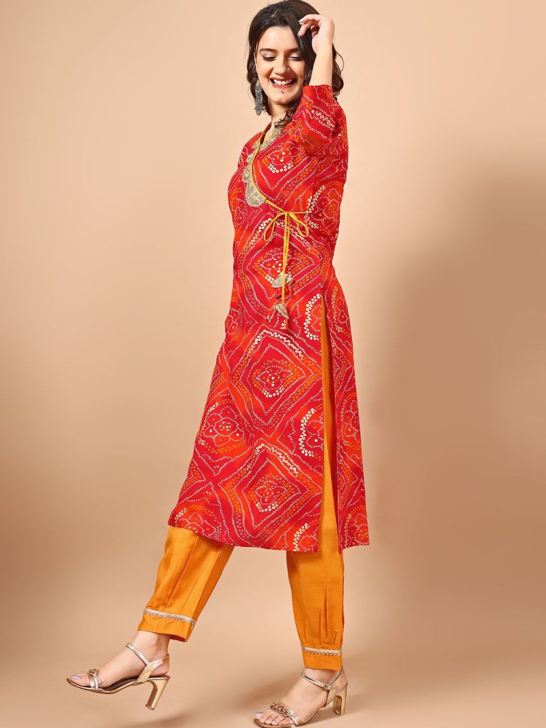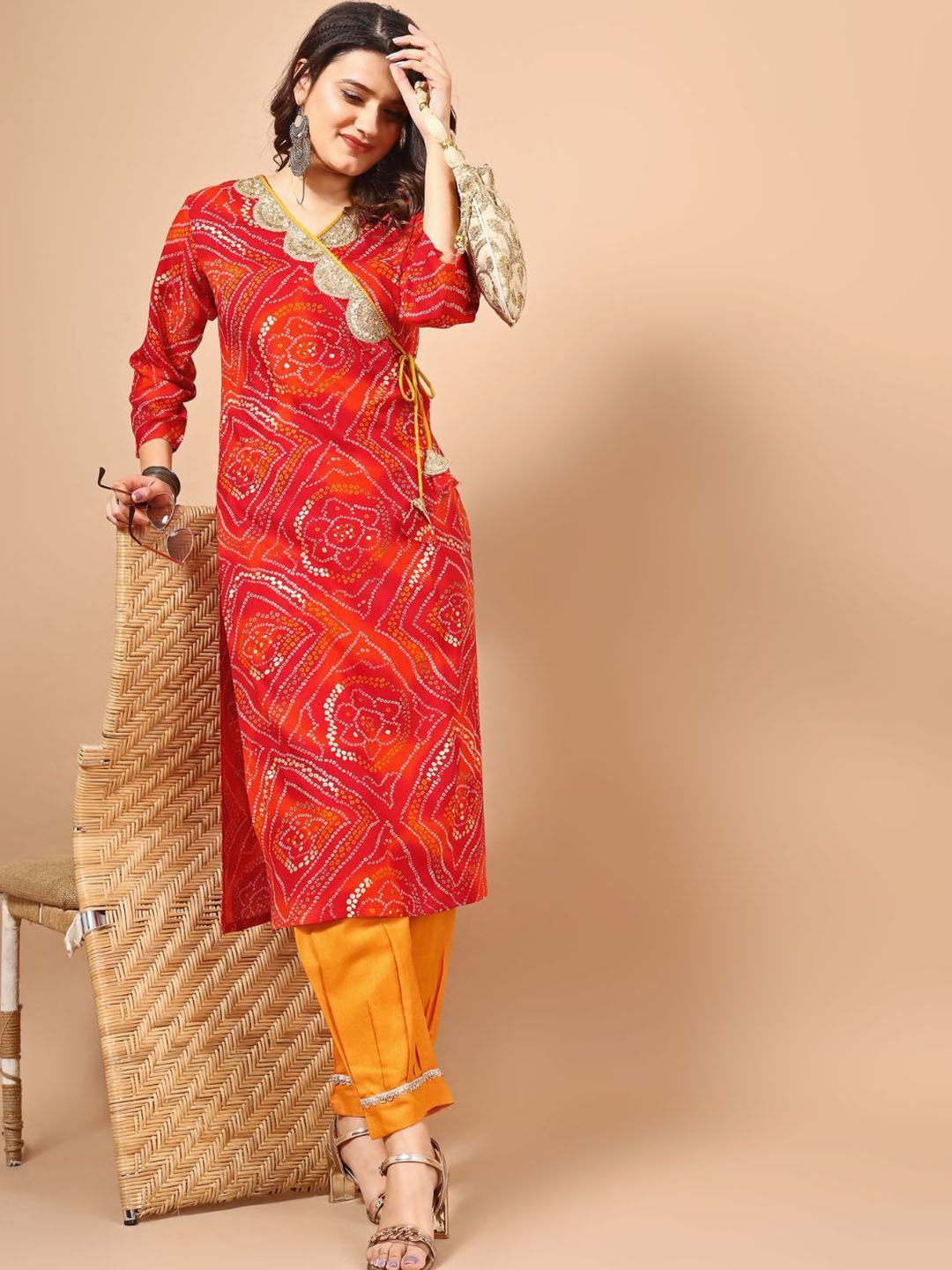 Red Bandhani V-neck Kurta — Knee Length, Straight Fit