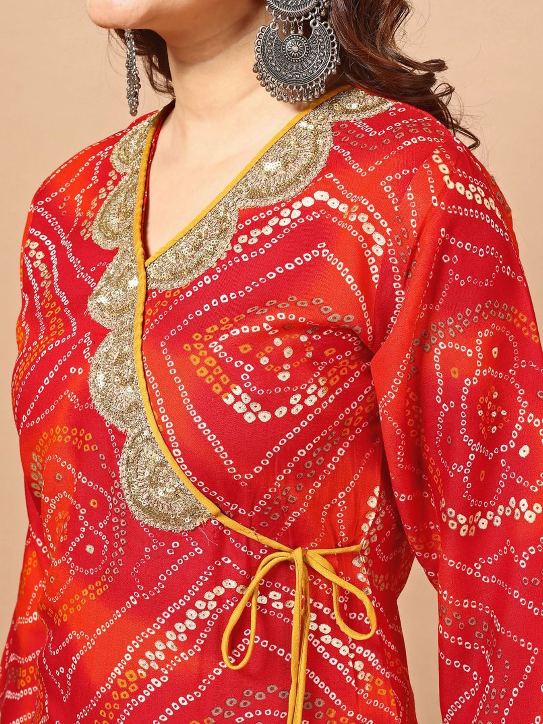 Bright red bandhani printed kurta with delicate sequin ornamentation — perfect for festive occasions and ethnic casual wear. Straight knee-length silhouette with side slits for easy movement and a clean, modern look.