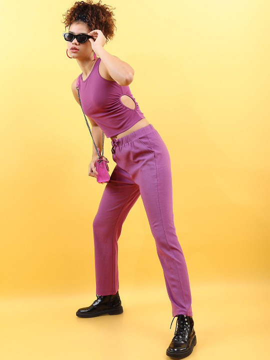 Pair this purple crop fitted top with high-waist jeans, wide-leg pants, or a skirt for a stylish casual outing. Add sneakers for a sporty vibe or heels for a chic finish.