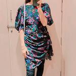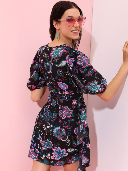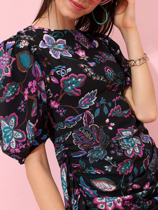 Black floral print sheath dress designed with a classic round neckline and short regular sleeves.